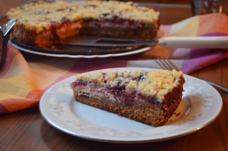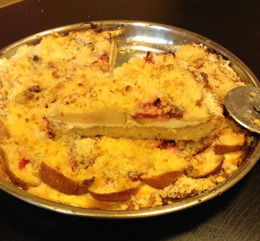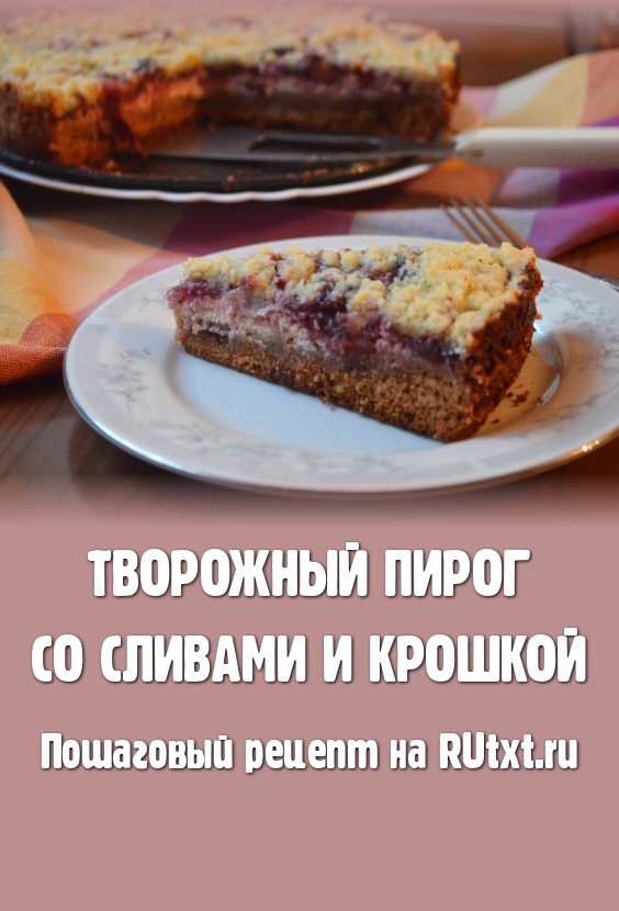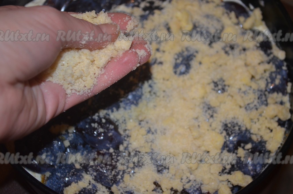 Сверху творожно-сливовый пирог посыпать крошкой.