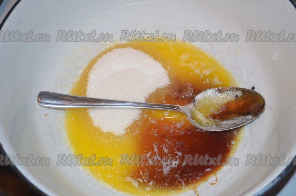 Сливочное масло растопить, добавить к нему мед и сахар, перемешать.