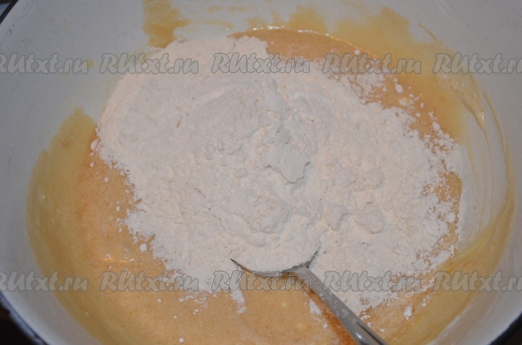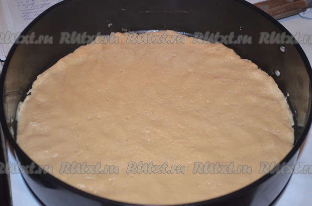 Распределить тесто по форме (24-26 см) тонким слоем, проколоть вилкой, выпекать основу пирога 15 минут при 180 градусах.