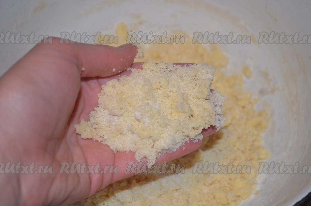 Для крошки охлажденное сливочное масло натереть на крупной терке, руками перемешать с сахаром и мукой.