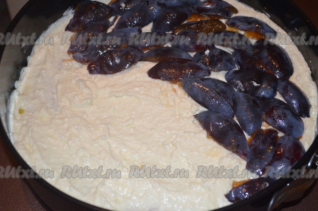 Достать форму с тестом из духовки, сверху распределить творожную начинку и слой порезанных на дольки слив.