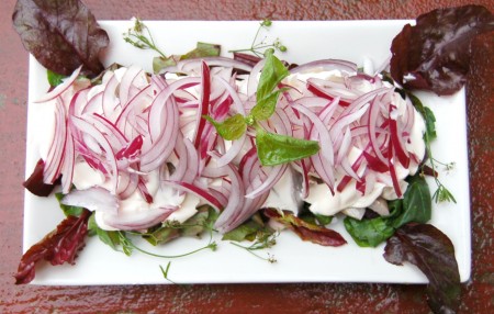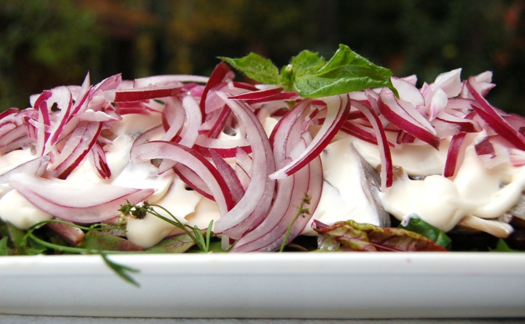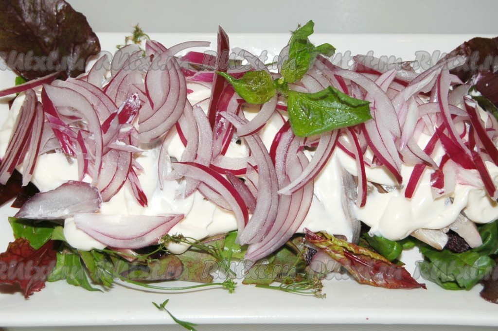 Залить майонезом и сверху выложить нарезанный тонкими пластинками репчатый лук.