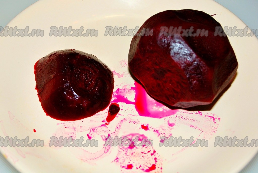 Отварить свеклу. Для этого свеклу помыть, залить холодной водой, довести до кипения и варить 25 минут. Отварную свеклу сразу залить холодной водой на 10 минут. Очистить свеклу от кожуры.