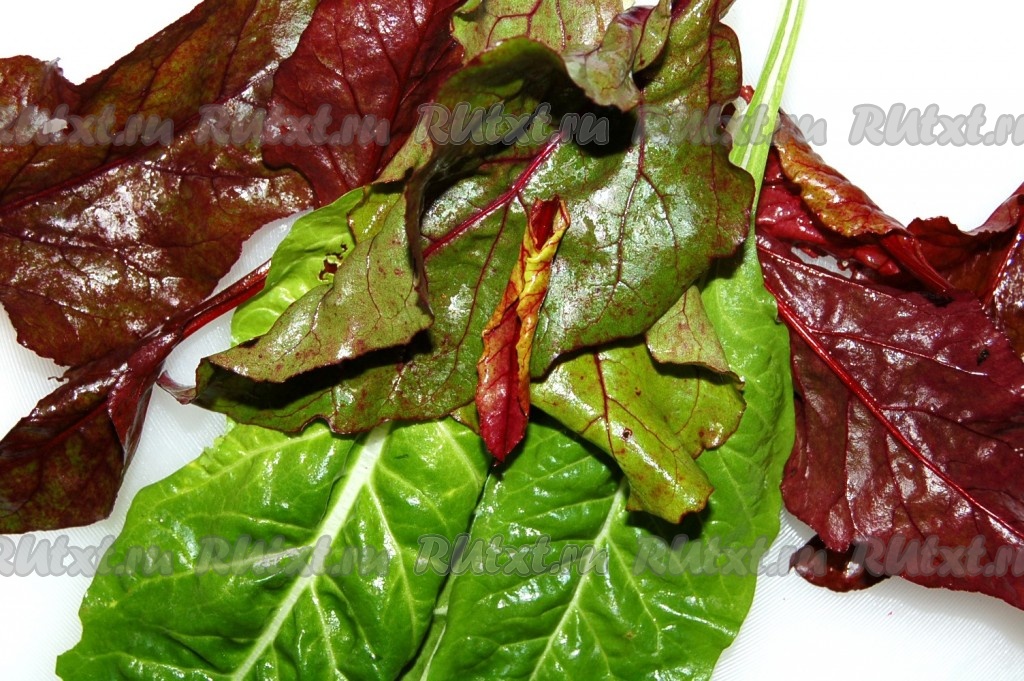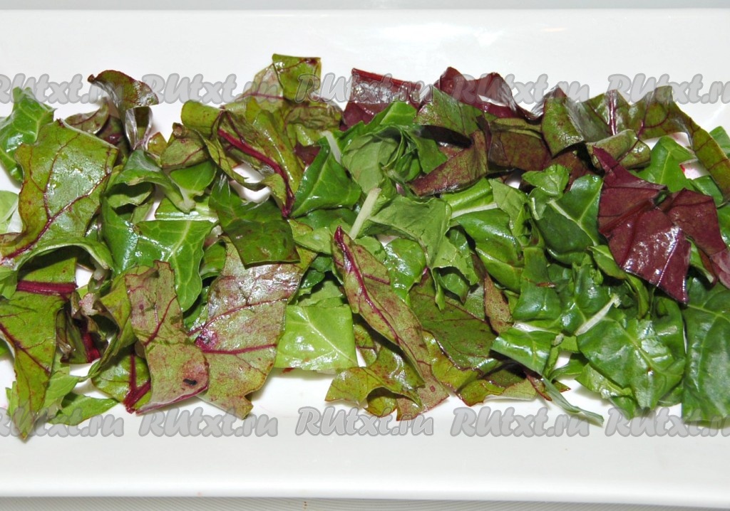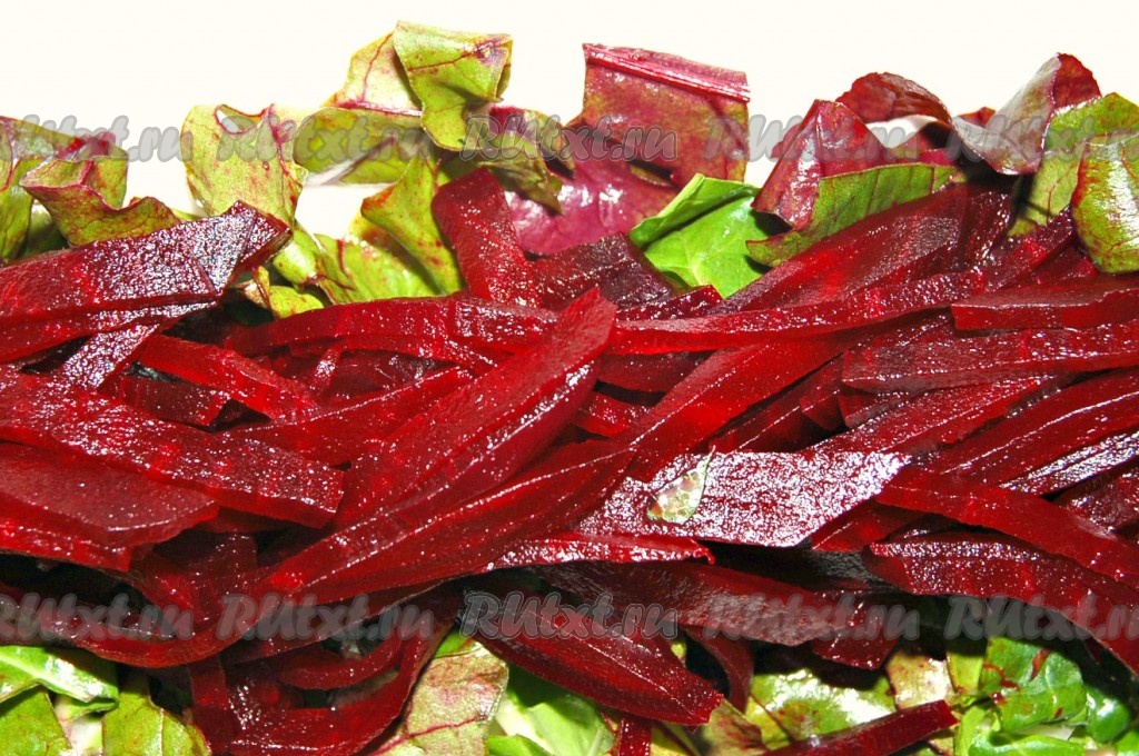 Свеклу нарезать сначала на тонкие кружки, а потом на небольшие брусочки. Выложить поверх листовой зелени.
