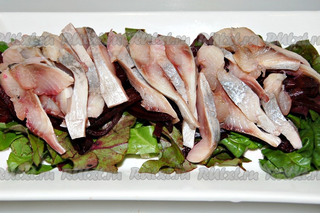 Нарезанные кусочки селедки выложить поверх свеклы.