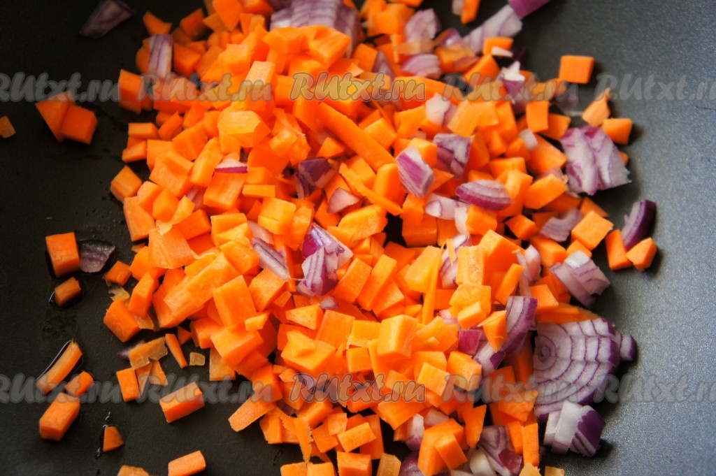 Морковь и лук очистить, мелко нарезать. Я использовала сладкий красный лук, но можно добавить и обычный. При желании, можно натереть морковь на крупной тёрке.