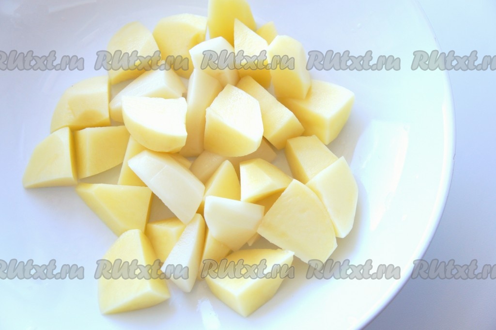 Бульон процедить, снова вылить в кастрюлю, поставить на огонь и дать закипеть. Картофель очистить, крупно нарезать, добавить в бульон, дать закипеть и варить минут 15 на небольшом огне.
