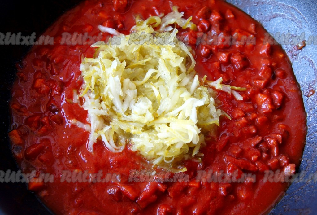 Добавить натёртые на крупной тёрке (мне так больше нравится) или нарезанные солёные огурцы, перемешать и тушить ещё 3-5 минут.
