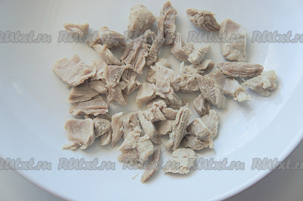 Мясо (я брала свинину, но можно взять и, например, курицу) выложить в кастрюлю, залить 2 литрами воды, поставить на огонь и варить до готовности мяса (время варки зависит от мяса, которое вы используете, - это может занять от 25 до 60 минут). Мясо извлечь из бульона, кости, если они есть, убрать, затем мясо нарезать.