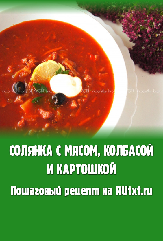 Солянку с мясом, колбасой и картошкой подавать к столу с ломтиком лимона, сметаной и зеленью. Приготовьте это аппетитное, сытное блюдо и насладитесь его насыщенным вкусом!