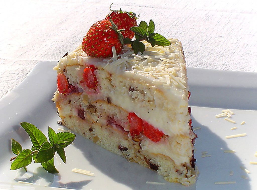 На днях пекла Ваш тортик, "нежность" - это действительно про него. Клубнички не было, заменила малинкой, в тесто положила различные орешки, шоколадные капли и вяленую вишню. Коржи выпекала в мультиварке по 15 минут, равномерно тесто не получилось разделить, поэтому хочу в следующий раз корж целиком выпечь, а потом разрезать на части. Благодарю Вас за рецепт! Оказался очень кстати, т.к ещё пекла и другой торт, а там по рецепту много желтков ушло, а здесь как раз белки пригодились 🙂