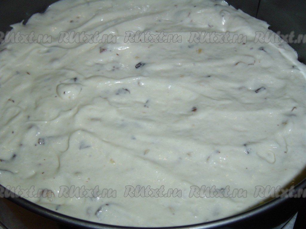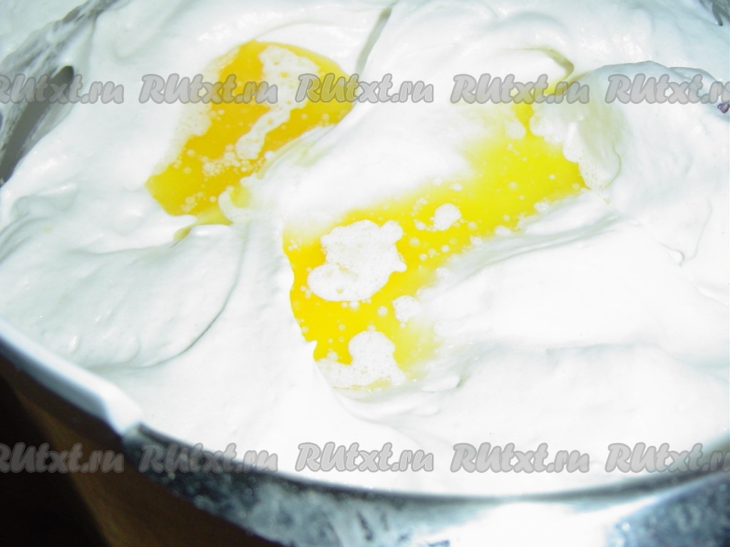 Отделяем белки от желтков (желтки нам в этом рецепте не понадобятся). Белки взбиваем миксером со щепоткой соли до мягких пиков, затем постепенно добавляем 150 грамм сахара и взбиваем до устойчивых пиков. Муку просеиваем с разрыхлителем, добавляем к белкам и аккуратно, лопаткой, перемешиваем, в конце добавляем растопленное остывшее сливочное масло и ещё раз перемешиваем тесто. Бисквитное тесто получится воздушным, в меру густым.