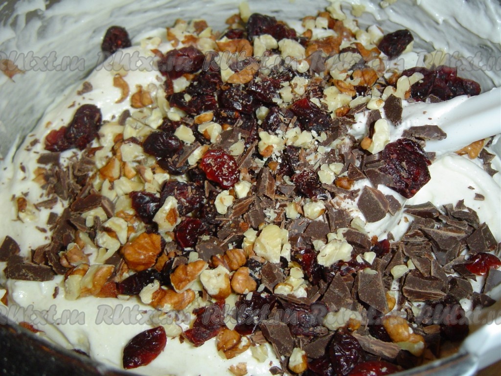 По желанию, в бисквитное тесто можно добавить сухофрукты, шоколад, орехи и т.д. Измельчаем орехи (не сильно), режем на мелкие кусочки шоколад и кладём в тесто, добавляем вяленую клюкву, перемешиваем.