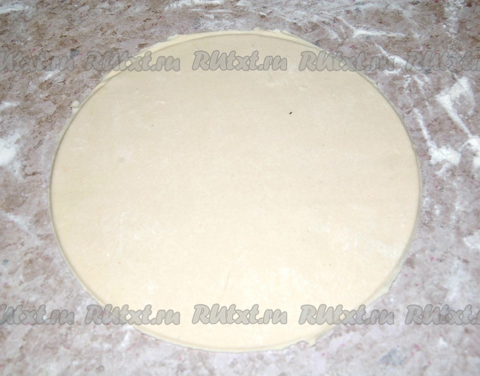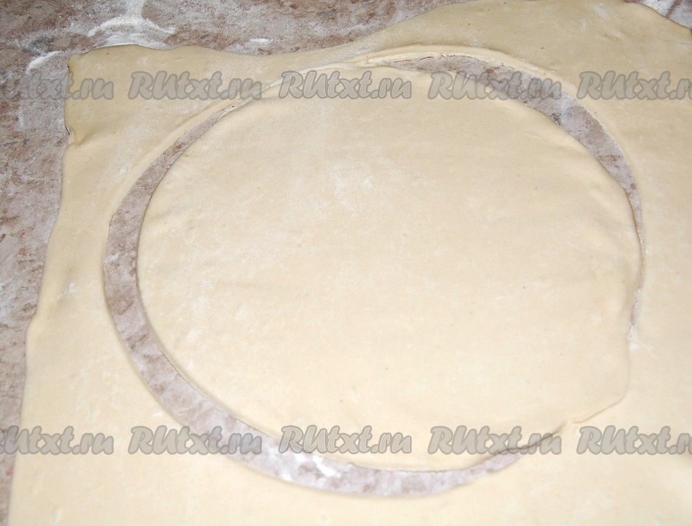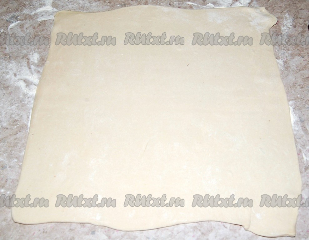 Готовое слоеное тесто разморозить, затем раскатать в тонкий пласт, толщиной примерно в 2 мм.