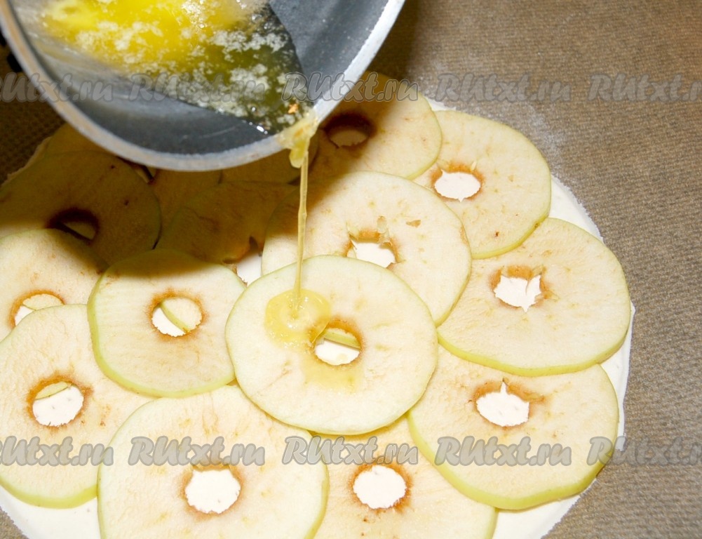 Растопить сливочное масло и растопленным маслом слегка полить сверху яблоки.