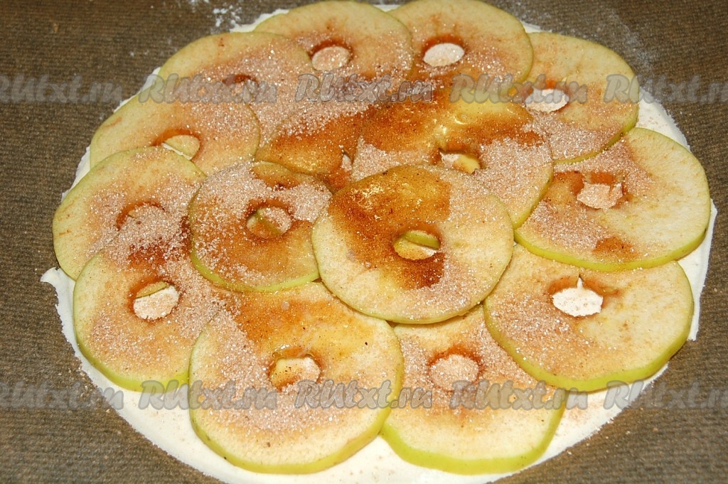Сахар смешать с корицей и посыпать сверху начинку из яблок. Отправить пирог в заранее нагретую до 200 градусов духовку на 15-20 минут.