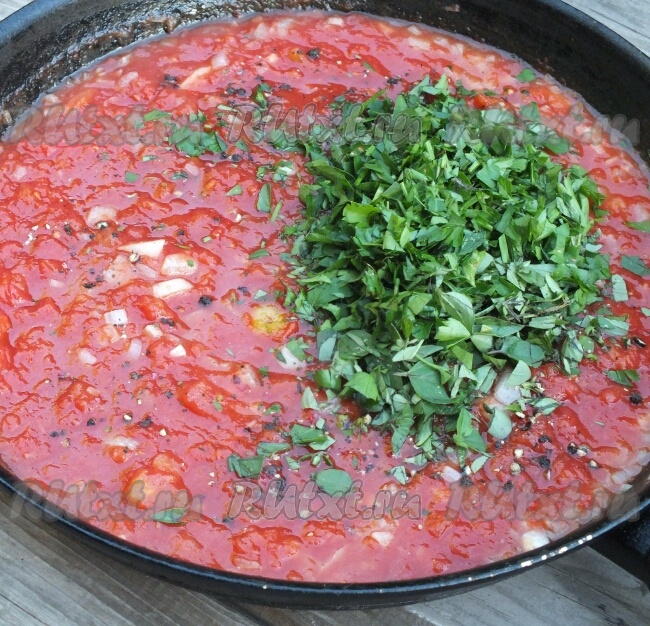 4. Пока варятся спагетти, к луку и чесноку добавить томаты, соль, перец, пряные травы и немного потушить 3-4 минуты на среднем огне, помешивая.
