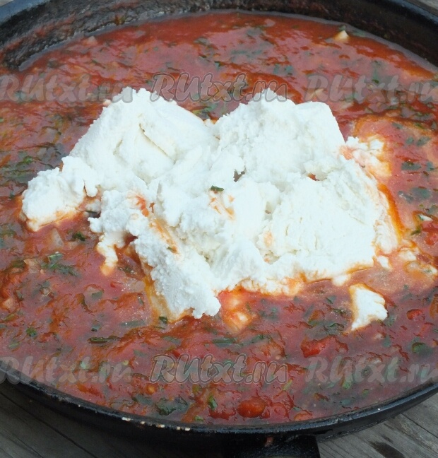 5. В соус добавить размятый сыр рикотта, тщательно перемешать и потушить еще одну минуту, выключить.