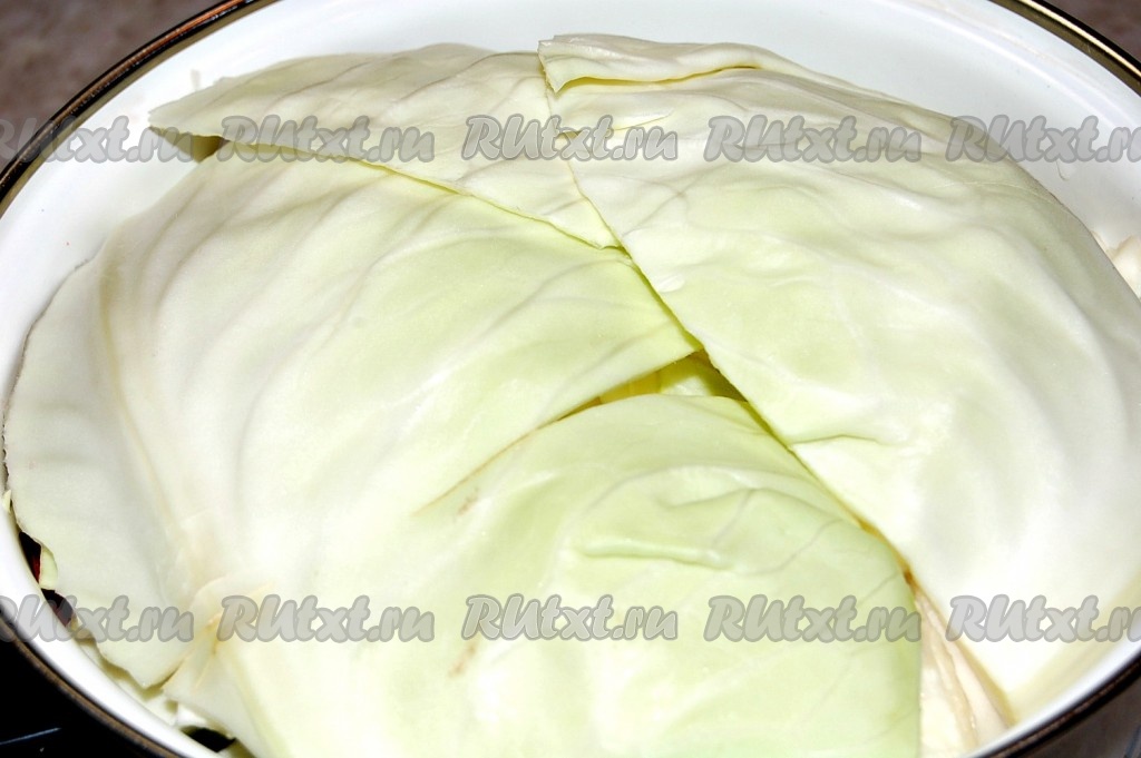 Прикроем капусту целыми капустными листьями.
