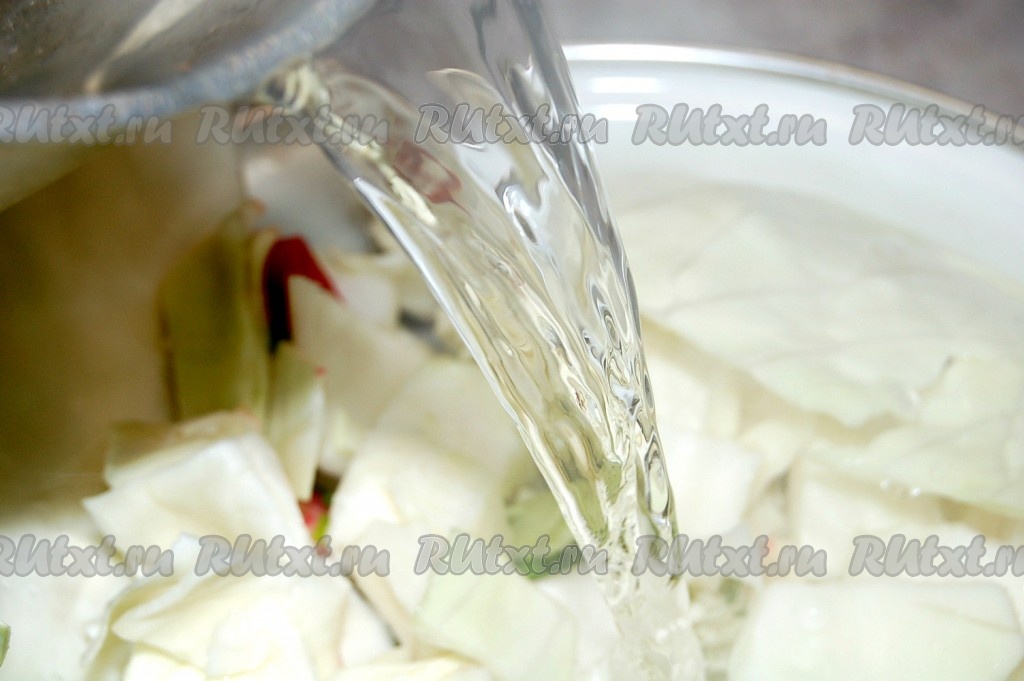 Приготовим рассол. Для этого вскипятим в кастрюле воду, добавим в нее соль, уксус и кипящим рассолом зальём капусту.