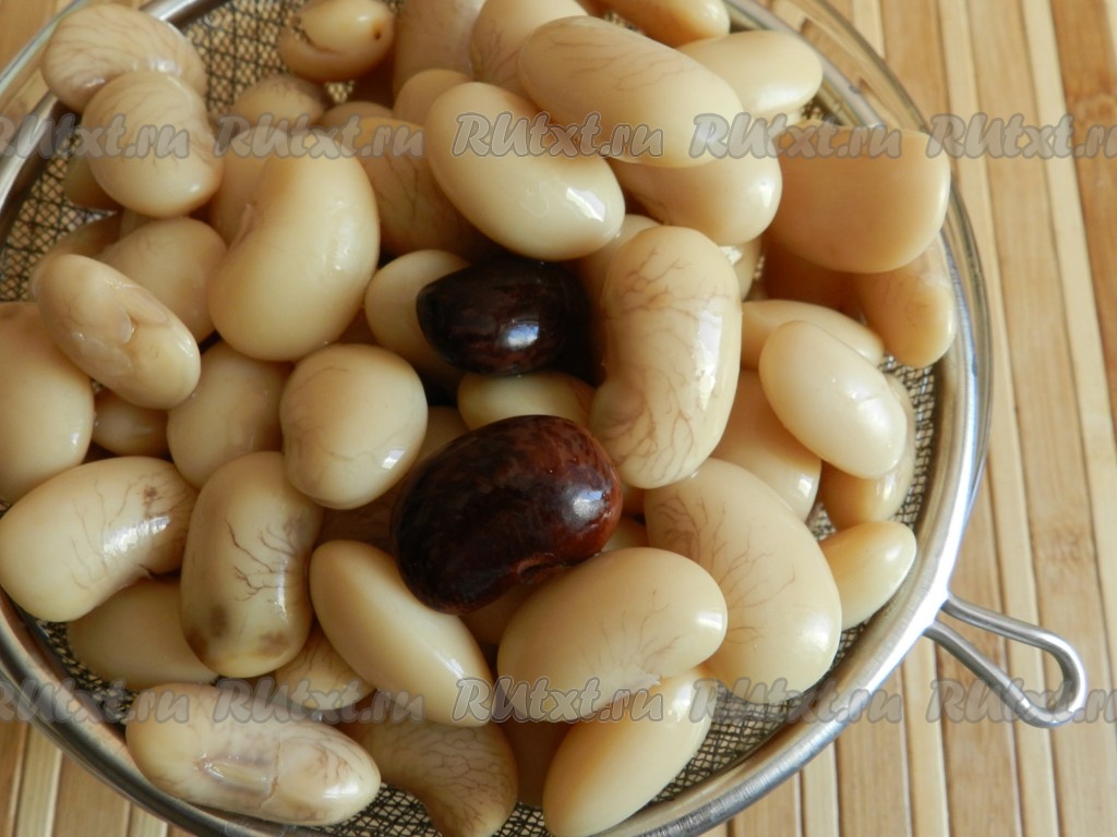 Утром воду слить, фасоль промыть под проточной водой. Высыпать в кастрюлю, залить достаточно большим количеством холодной воды и поставить на огонь. Варить фасоль с момента закипания около 1 часа (до мягкости). Продолжительность варки во многом зависит от сорта фасоли. Если фасоль твёрдых сортов, в процессе варки можно добавлять холодную воду, это способствует развариванию фасоли. Мне не требовалось доливать воду. За 5-10 минут до окончания варки посолить фасоль. Воду слить, немного воды, в которой варилась фасоль, оставить.