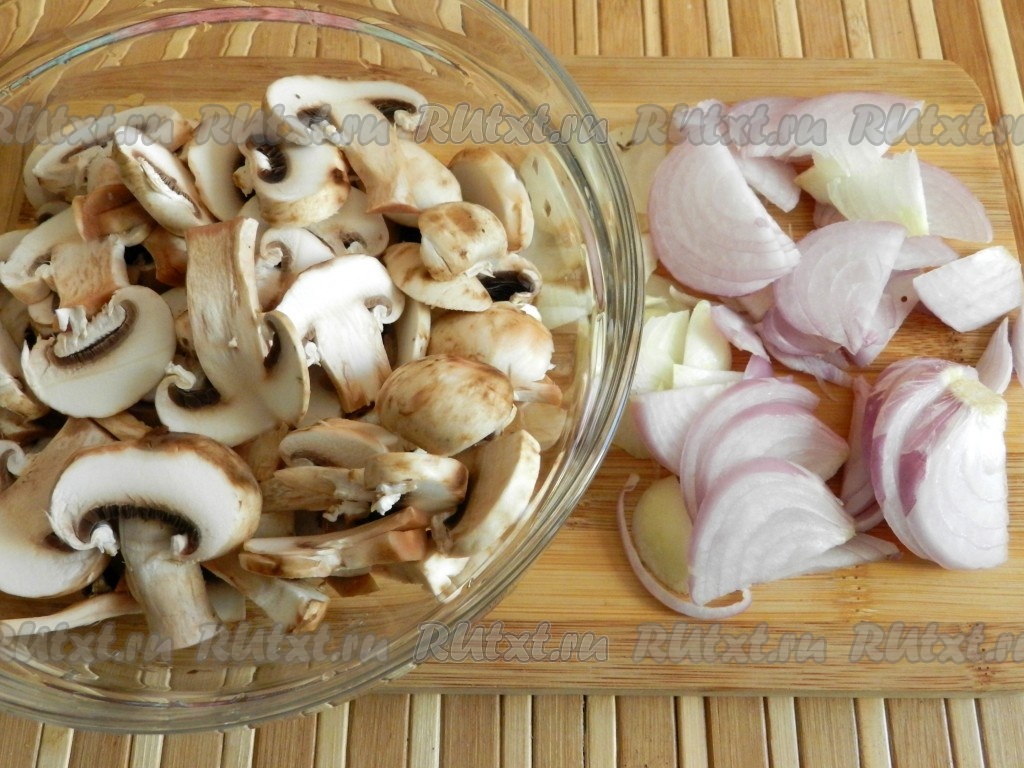 Шампиньоны промыть водой, удаляя с грибов загрязнения. Лук очистить. Шампиньоны нарезать на пластины, лук - на достаточно тонкие полукольца (или четверть кольца).