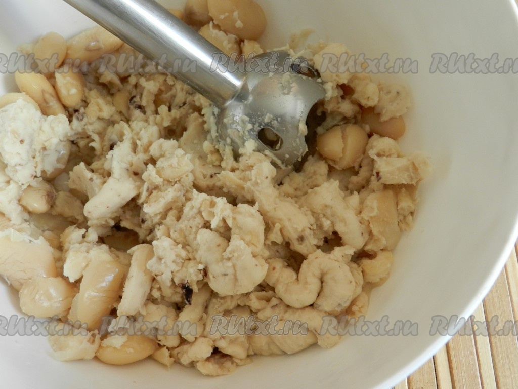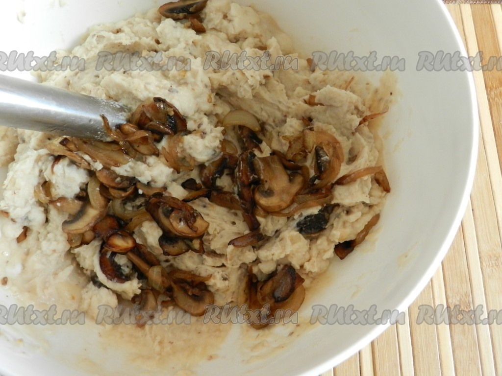 К измельчённой фасоли добавить шампиньоны, обжаренные с луком, и измельчить всё вместе блендером, оставляя в паштете небольшие кусочки грибов.