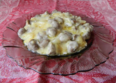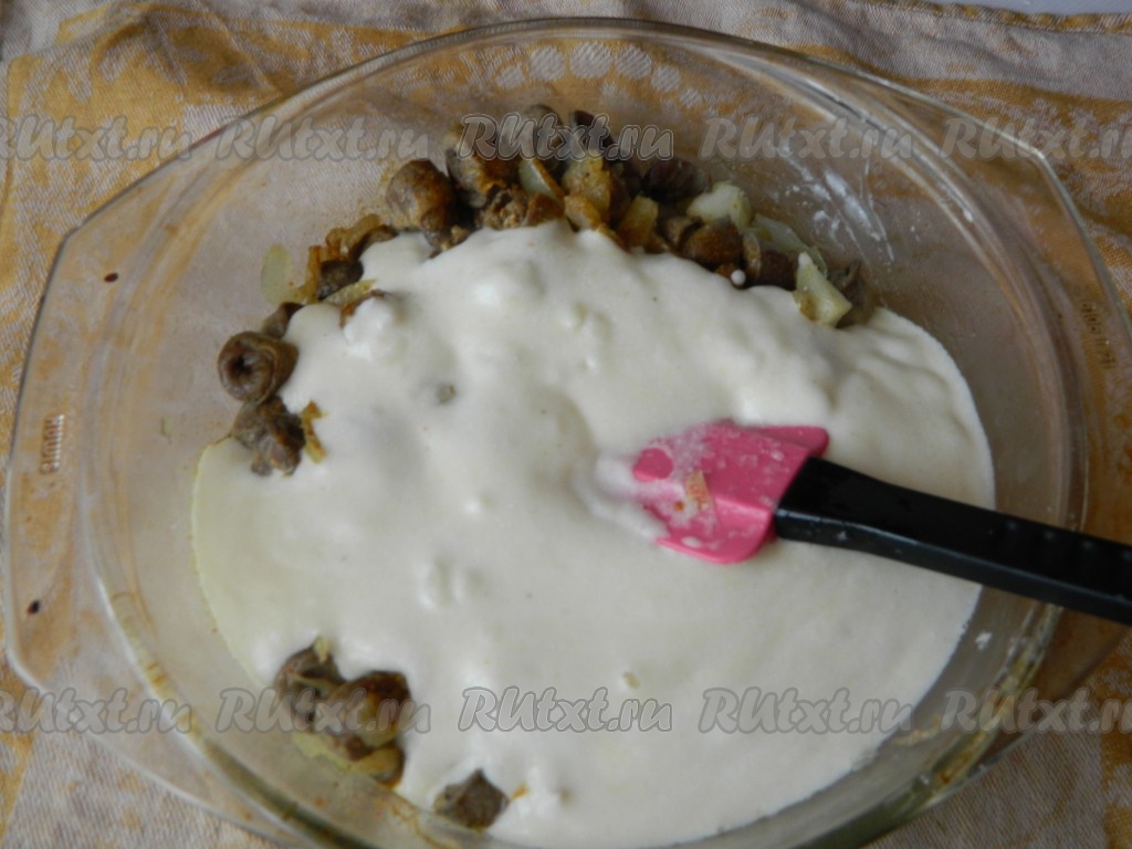 Туда же добавляем сметанно-мучную смесь, все хорошо перемешиваем и ставим на 5-10 минут в духовку.
