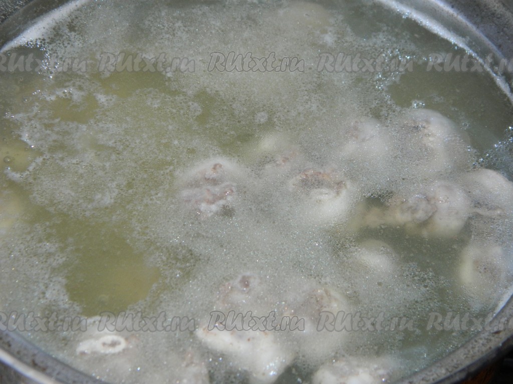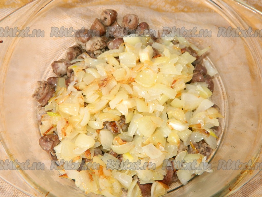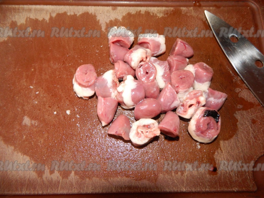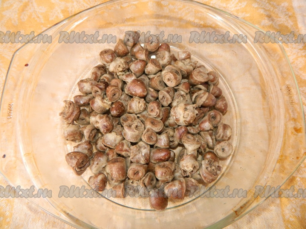 Когда куриные сердечки сварятся, сливаем воду и для удобства перекладываем их в глубокую огнеупорную посуду.