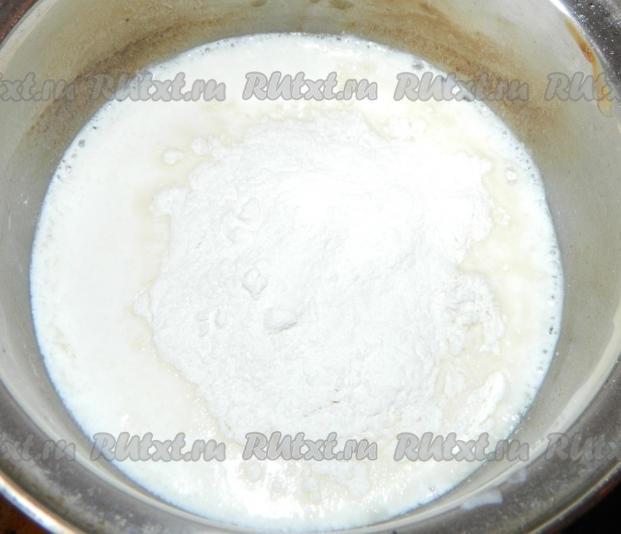 В закипающую воду со сметаной засыпаем муку и, хорошо перемешивая, варим 1-3 минуты.