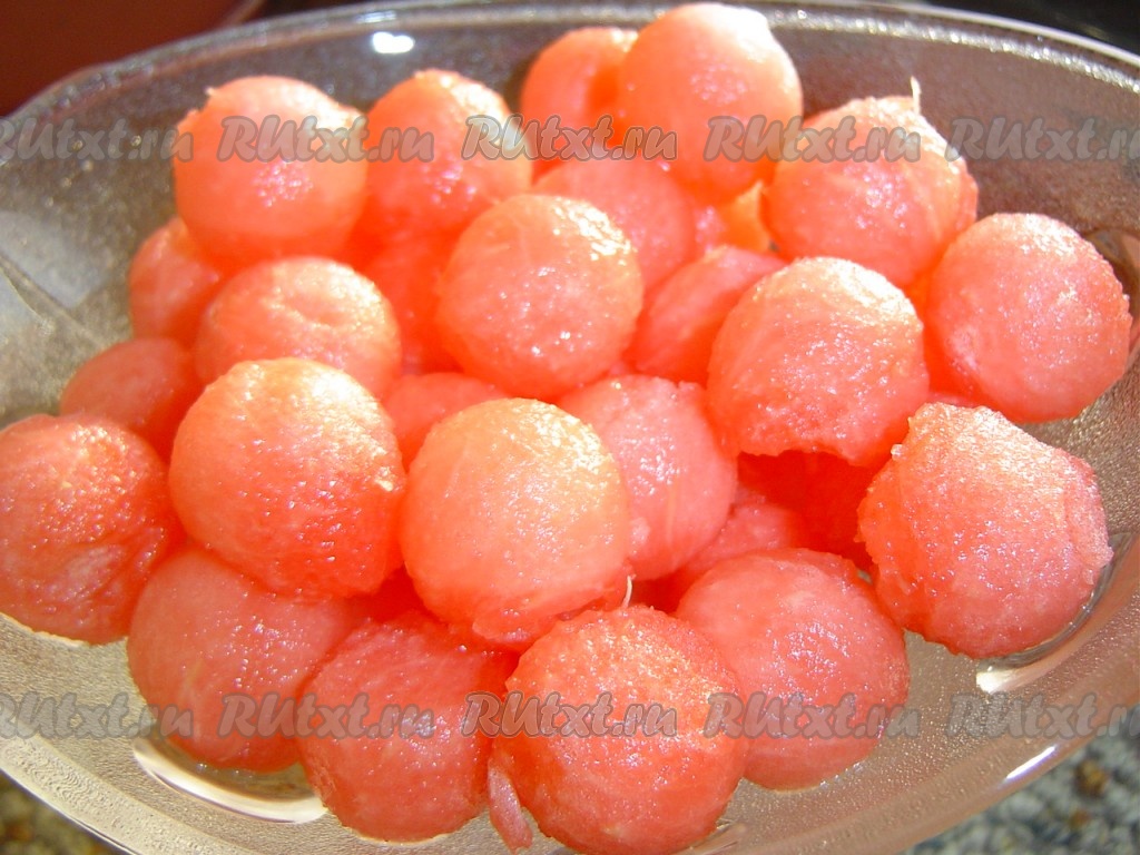 Мякоть арбуза очищаем от семечек и нарезаем кубиками (я сделала шарики с помощью ложки-нуазетки).