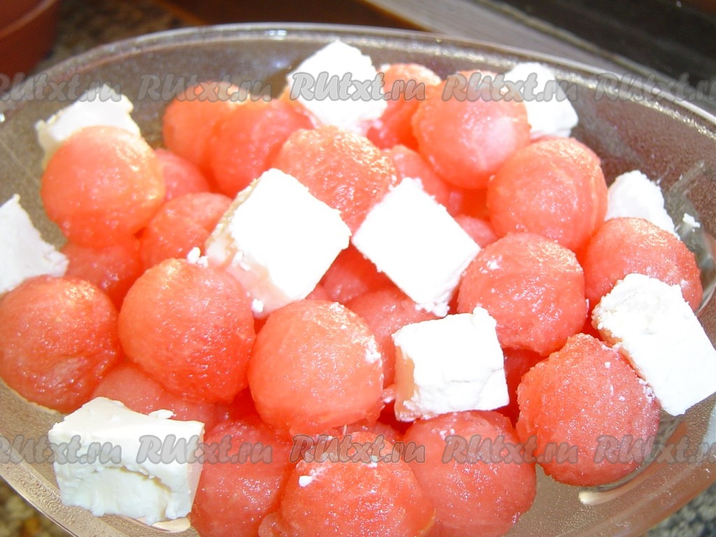 Наш арбузный салат поливаем заправкой из масла и бальзамического уксуса и убираем в холодильник на 20-30 минут.