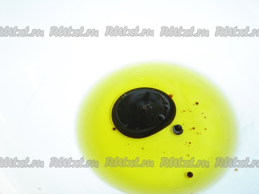 К оливковому маслу добавляем бальзамический уксус и тщательно перемешиваем до однородной массы.
