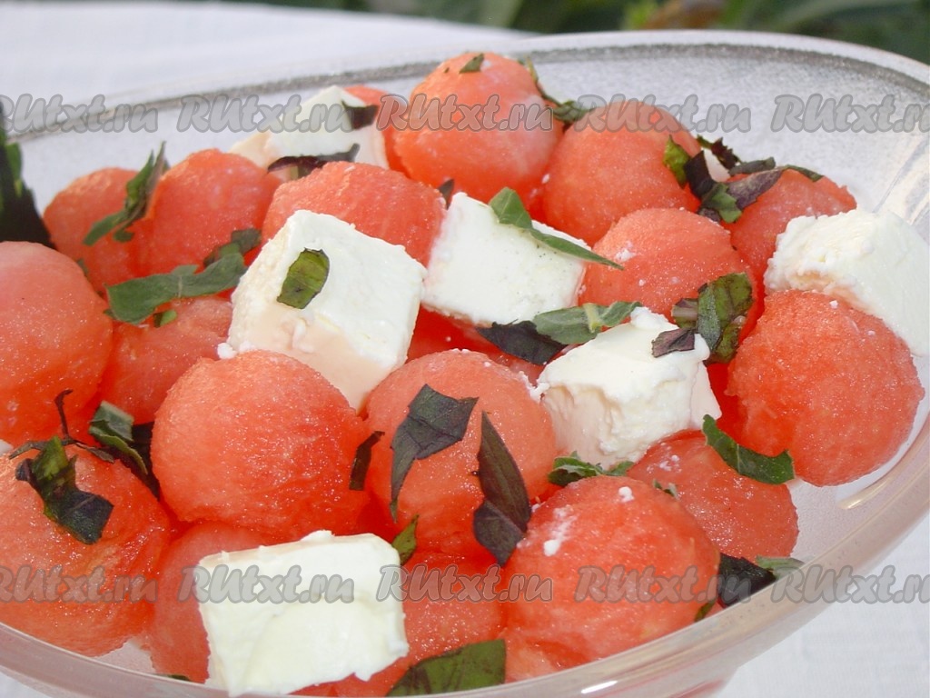 Легкий, освежающий арбузный салат с фетой, мятой и базиликом готов. Приятного аппетита!
