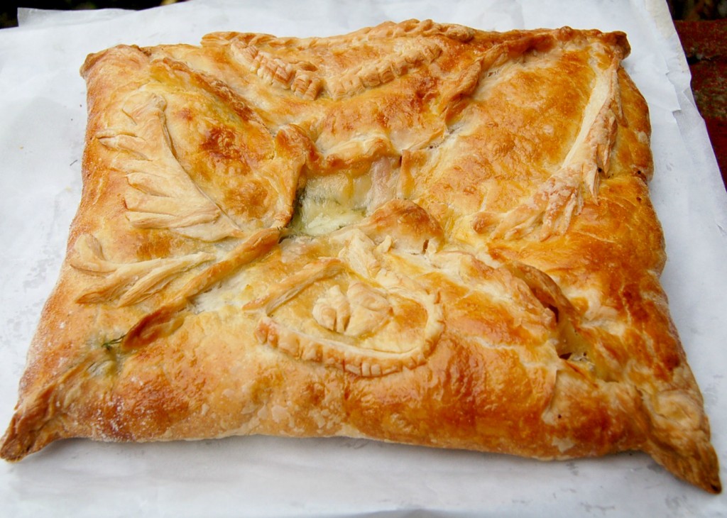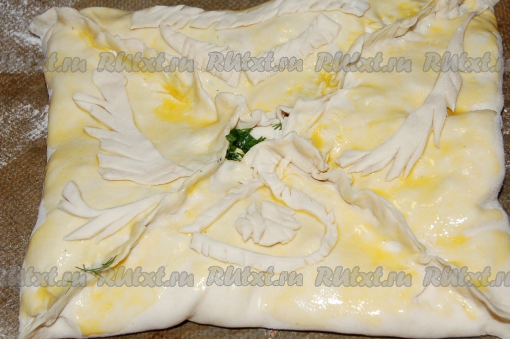 В центре оставить дырочку, через нее будет выходить пар. Смазать всю поверхность пирога из слоеного теста взбитым яйцом. Отправить пирог с разными начинками в заранее нагретую до 180 градусов духовку на 20 минут.