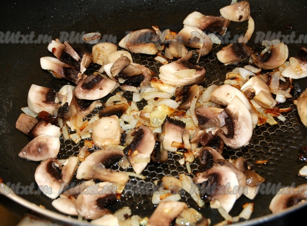 Сначала нужно приготовить разные начинки для нашего пирога. Для приготовления 1-ой начинки разогреть сковороду с растительным маслом и поджарить на ней до готовности мелко нарезанный репчатый лук с тонко нарезанными шампиньонами. Посолить и поперчить. Для этого понадобится около 10 минут.