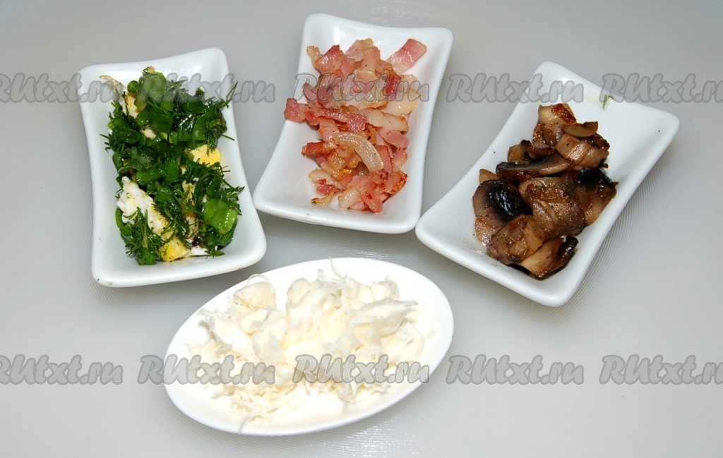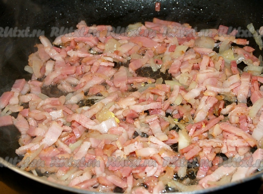 Для приготовления 2-ой начинки нарезать бекон (или ветчину) тонкими полосками и поджарить на растительном масле с мелко нарезанным репчатым луком. Для этого тоже понадобится 10 минут.