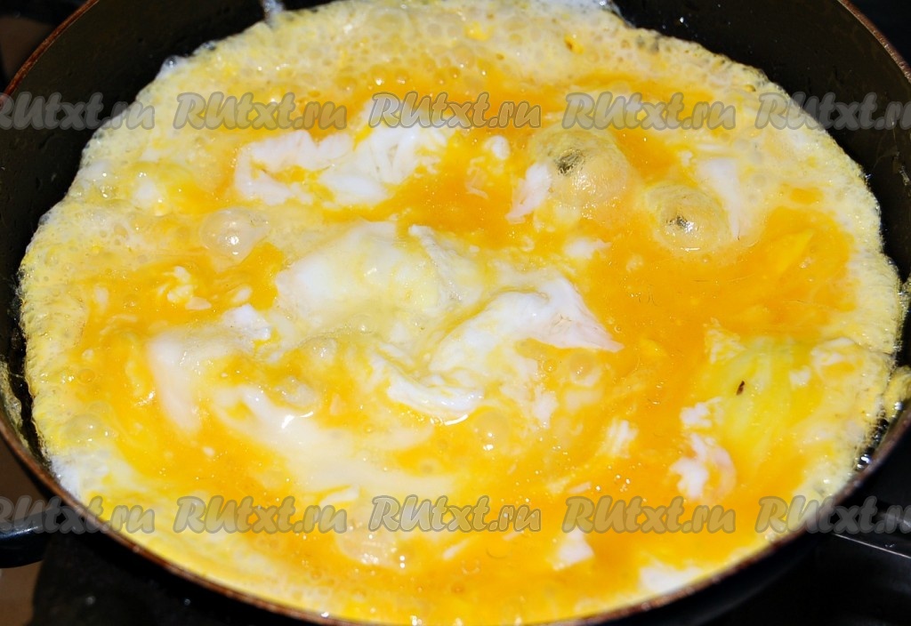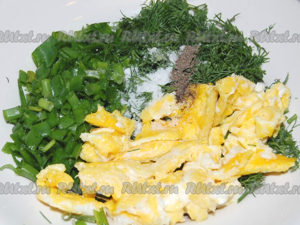 Нарезать мелко зеленый лук и укроп и смешать с яичным омлетом. Посолить и поперчить.