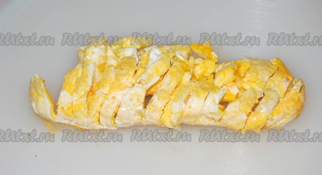 Для приготовления 3-ей начинки разогреть растительное масло на маленькой сковородке, вылить яйцо и приготовить из него тонкий омлет. Затем омлет свернуть рулетиком и нарезать на тонкие кусочки.