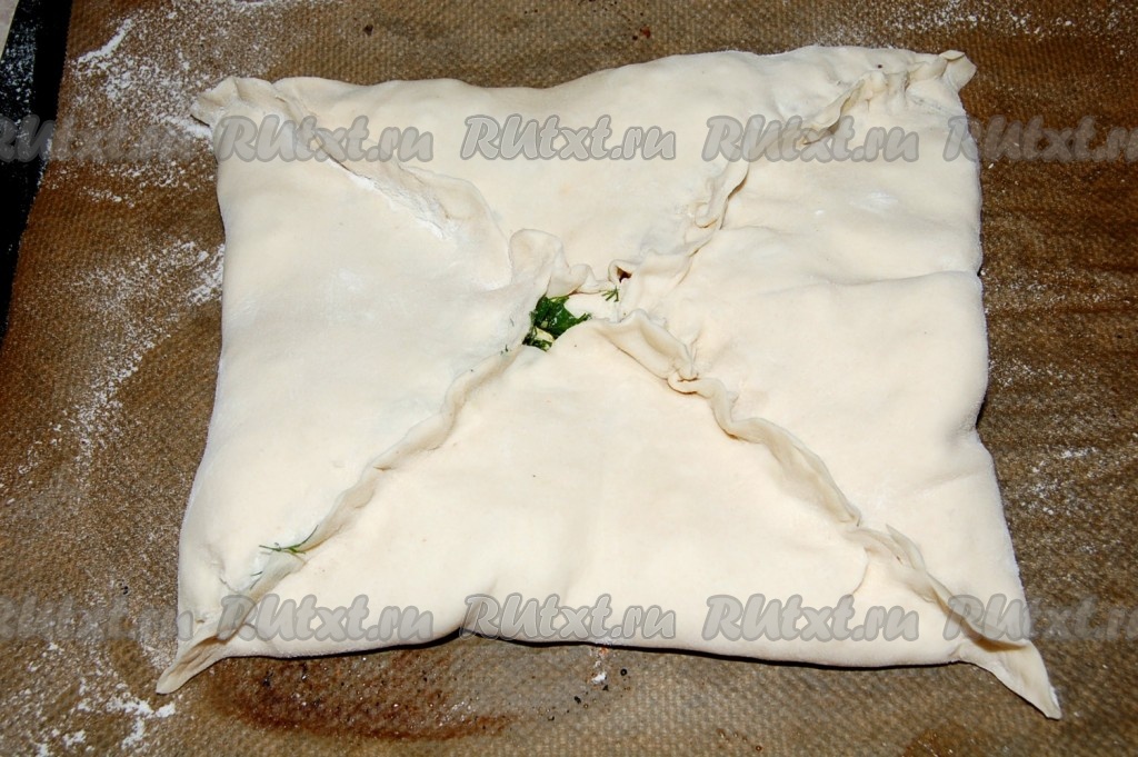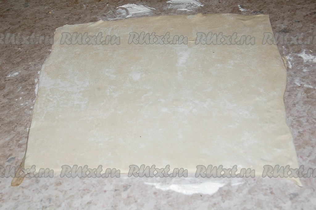 Разморозить готовое слоеное тесто. Раскатать в пласт квадратной формы.