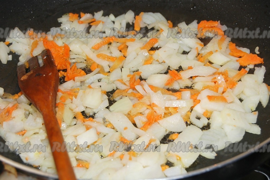 Сначала нужно приготовить начинку. Для этого нужно нарезать репчатый лук мелкими кусочками и морковь натереть на крупной терке, обжарить все вместе до полуготовности на оливковом масле.