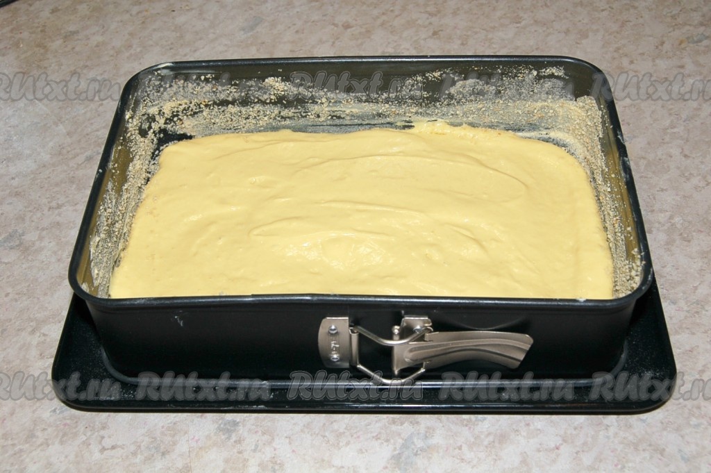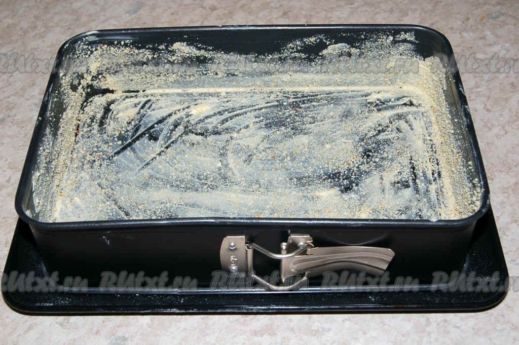 Форму для пирога смазать холодным сливочным маслом (или маргарином) и обсыпать сухарями. Излишки сухарей стряхнуть.