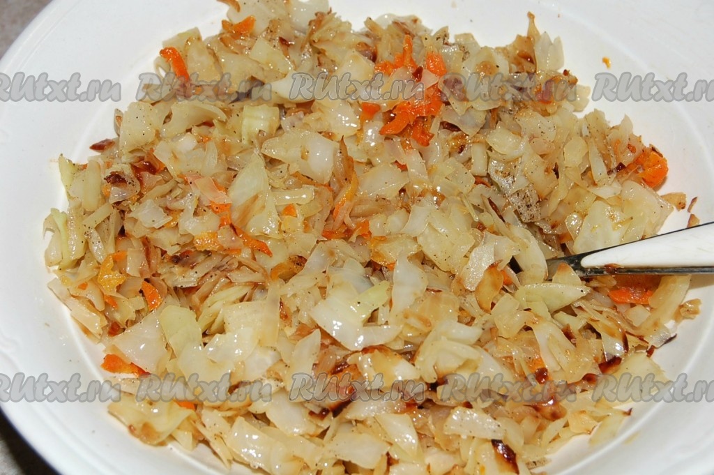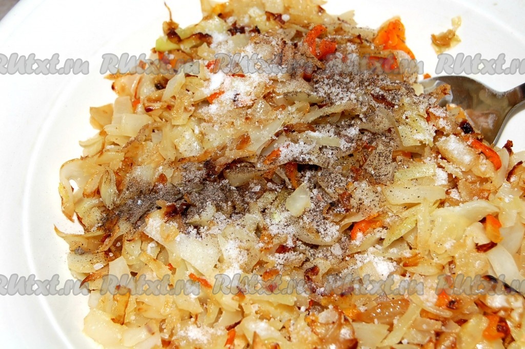 Готовую начинку переложить в миску, остудить и после этого посолить и поперчить. Начинка для быстрого пирога с капустой готова.