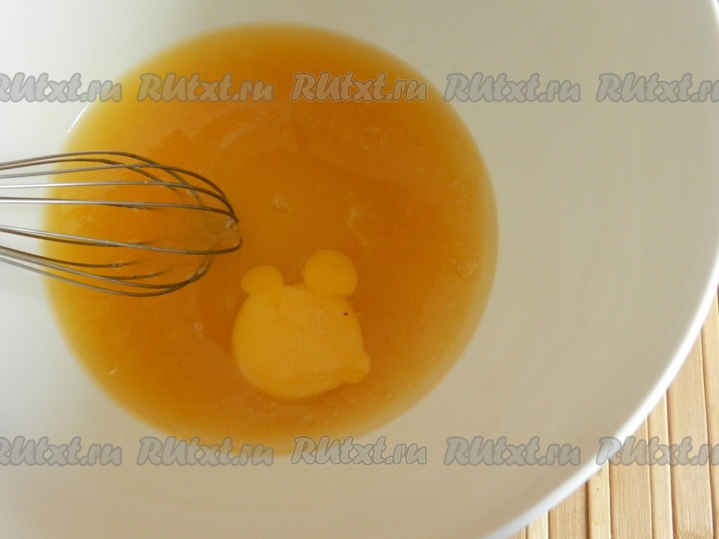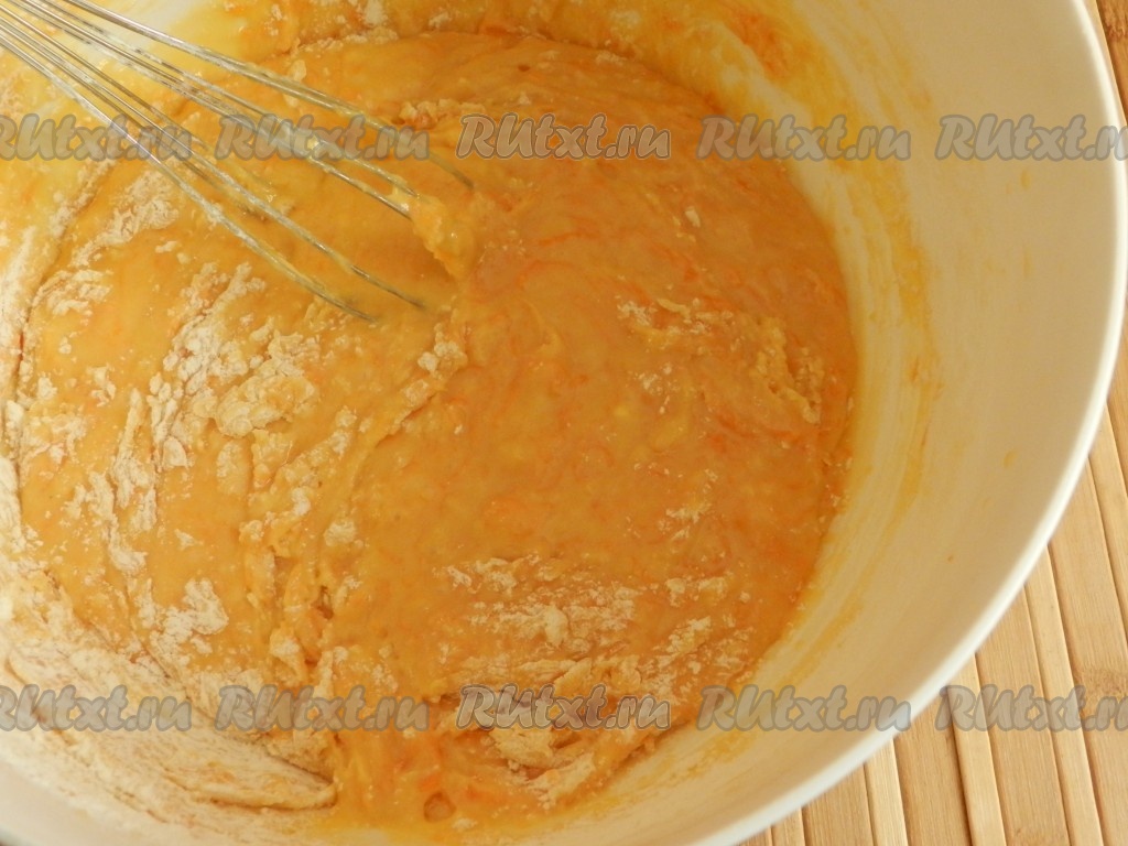 Всыпать сахар, муку с разрыхлителем, тщательно перемешать, чтобы не было комков.