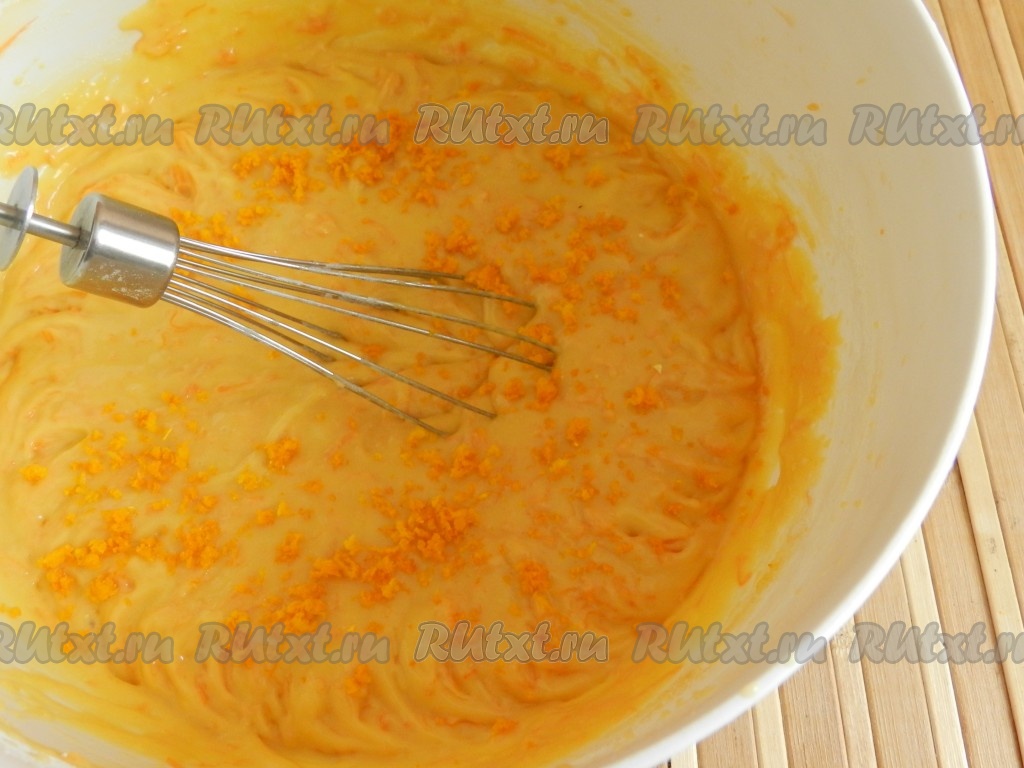 Масло растопить и остудить. 250 грамм очищенной тыквы натереть на мелкой тёрке. С апельсина снять цедру (если нет апельсина, можно обойтись и без добавления цедры в тесто).