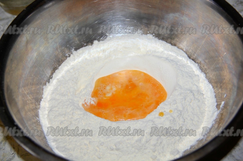 Приступим к замешиванию теста, для этого муку просеиваем в миску, тем самым напитываем её кислородом. К муке добавляем яйцо, уксус, тёплую воду и растопленное сливочное масло.