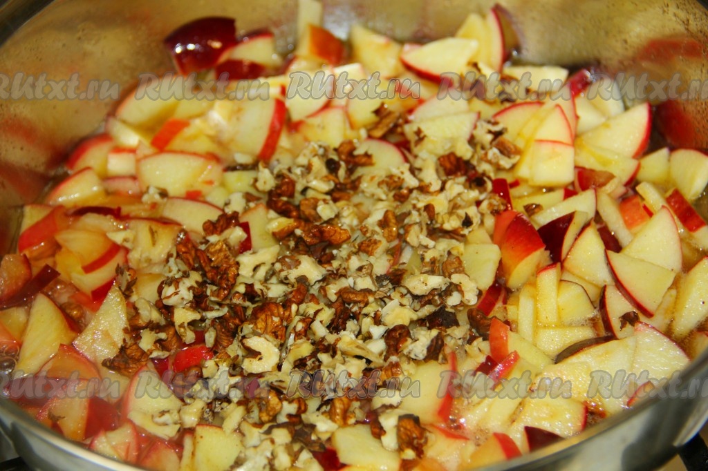 Через пару минут к яблокам отправляем измельчённые орехи. Тушим под крышкой, иногда помешивая, до тех пор, пока яблоки не станут мягкими.