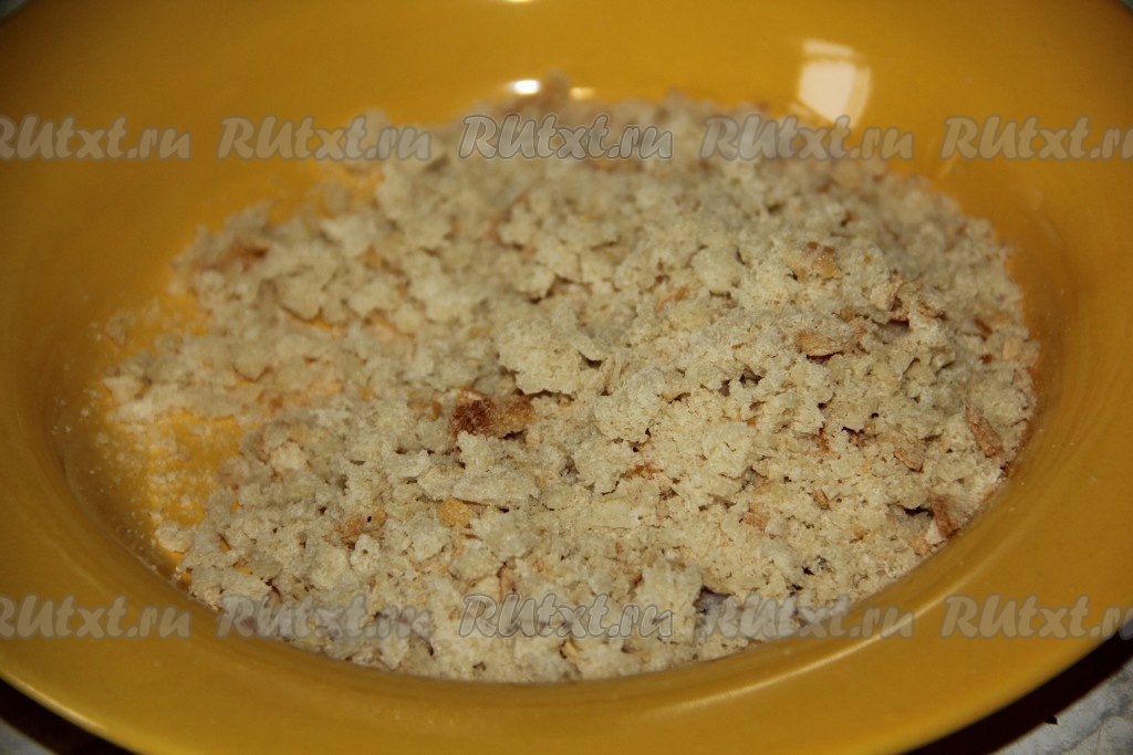 Теперь перейдём к панировочным сухарям. Если у вас есть покупные измельчённые сухари, то можете пропустить этот пункт. У меня же сухарей не оказалось и я использовала обычный подсушенный хлеб, который измельчила в блендере. Для чего нам нужны сухари, вы узнаете дальше.