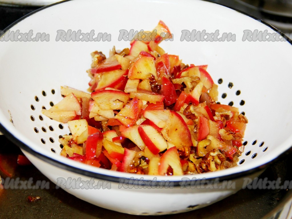 Когда яблоки станут мягкими, снимаем с огня, даём им остыть. Яблоки откидываем на сито и даём стечь лишней жидкости. Начинка из яблок и грецких орехов для штруделя готова.