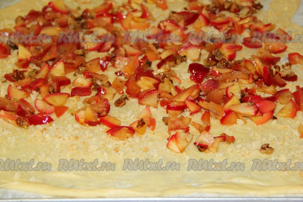 Когда тесто раскатано, выкладываем на него сухарики. "Зачем нужны сухари для штруделя?", - спросите вы. Сухари используются для того, чтобы наше тесто осталось хрустящим и не стало влажным во время выделения яблочного сока при выпечке. На сухари выкладываем яблоки с грецкими орехами, не доходя до краёв.